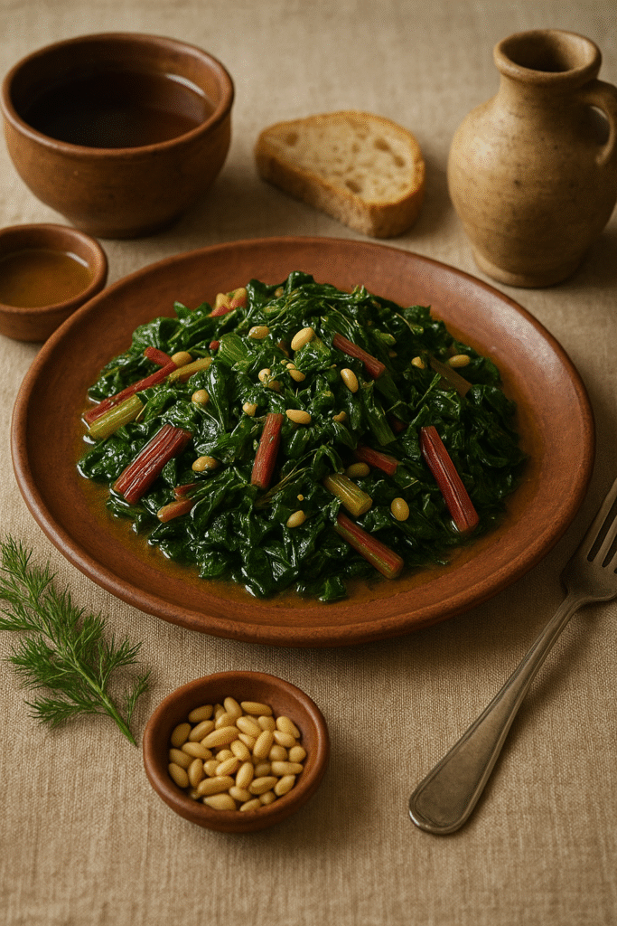 では、「女王リウィアが食べていたかもしれないローマ時代風スイスチャード料理」を、当時の食文化やレシピ記録(Apicius など)を参考に再現してみます。